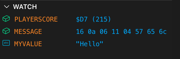 The Watch panel formats values based on the symbol’s type and whether the watch is direct or memory-based.